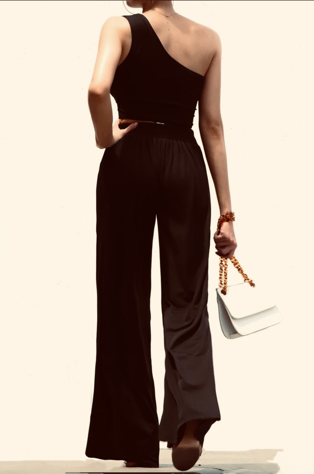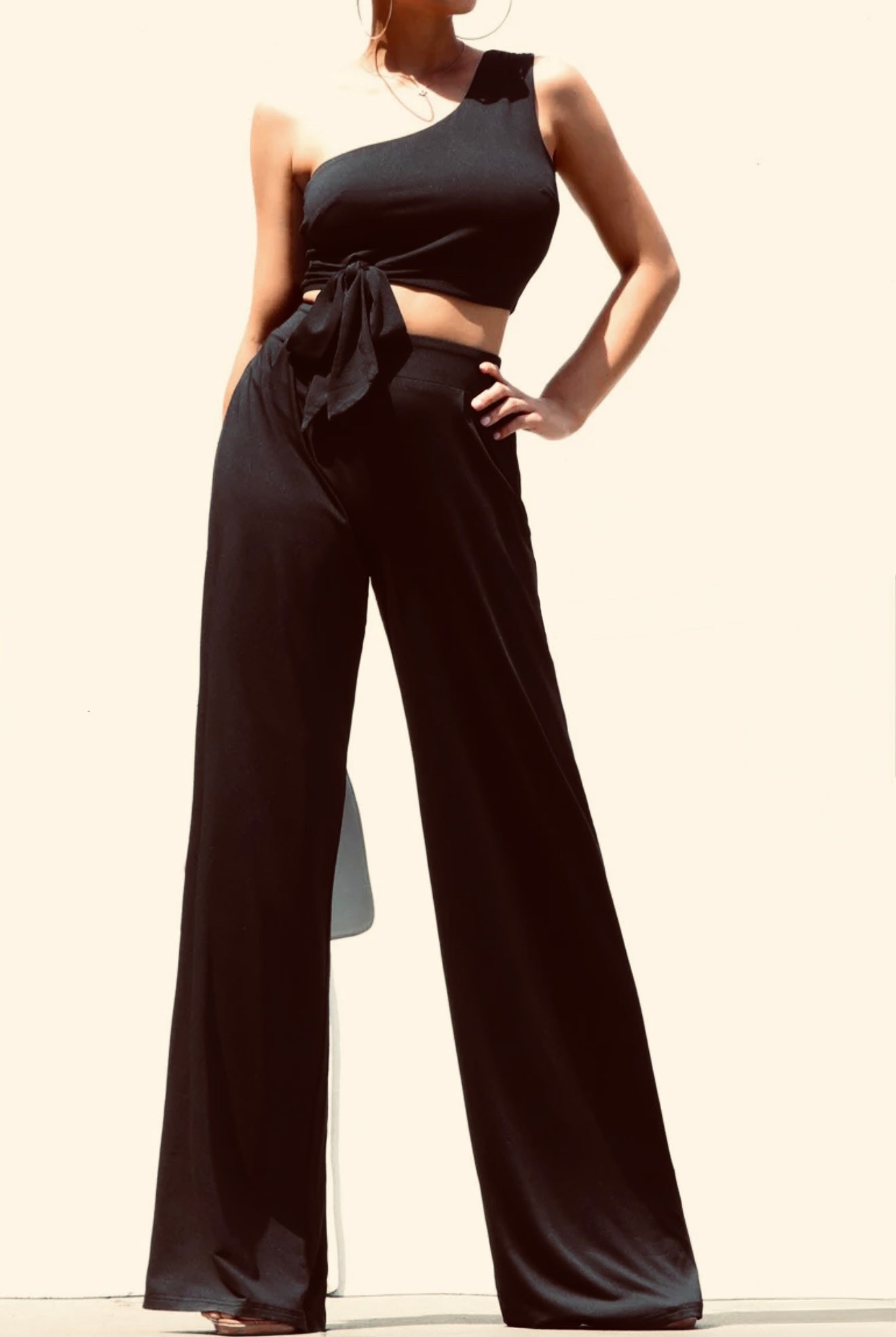 When power meets poise. The Midnight Moves Set is your go-to for effortlessly commanding attention. Featuring a one-shoulder crop top with a dramatic side tie and wide-leg high-waist pants, this set brings sleek sophistication with a hint of sass. Crafted from flowy, breathable fabric, it’s the definition of comfort meeting confidence.